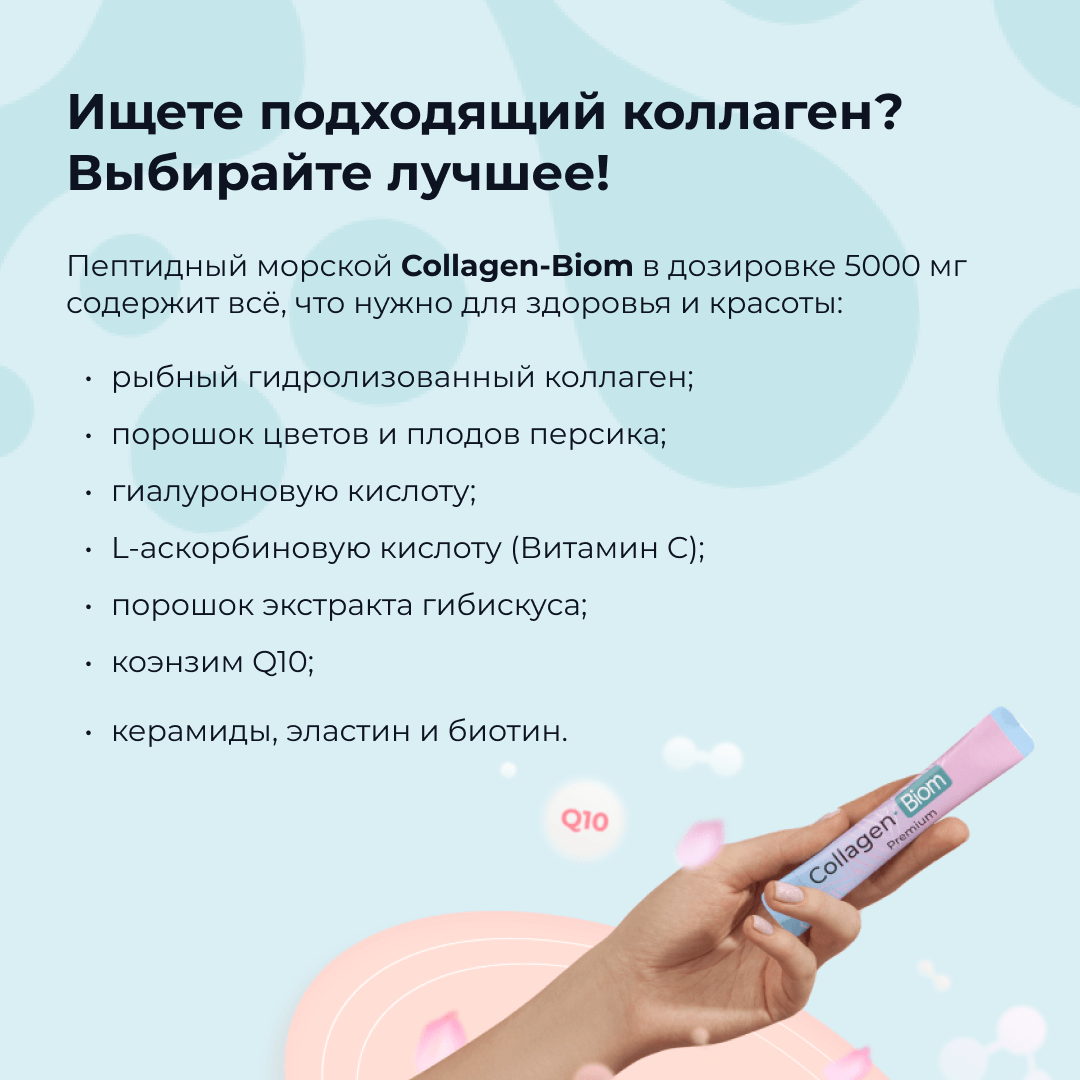 Для достижения максимальной эффективности восполнения коллагена лучше всего сочетать правильное питание с приемом биодобавок. Так, пептидный морской коллаген Collagen-Biom оказывает комплексное воздействие на организм: